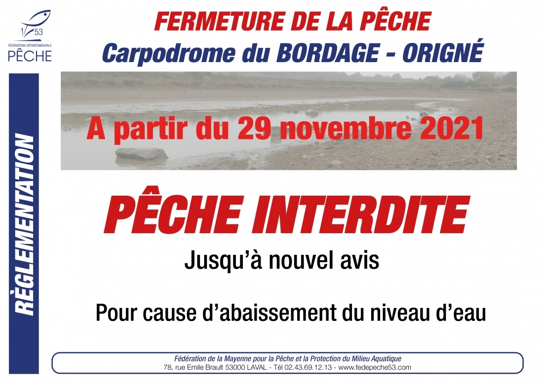 Des travaux d'aménagement au carpodrome du Bordage à ORIGNÉ sont prévus dans les semaines à venir. Pour le bon déroulement de cette opération, la Fédération de pêche procédera à un abaissement partiel du niveau d'eau.
