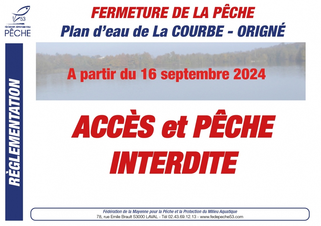 Des travaux d'aménagement sur le réservoir black bass de la Courbe à ORIGNÉ sont prévus dans les semaines à venir. Pour le bon déroulement de cette opération, la Fédération de pêche fermera l'accès au site le 15 septembre au soir.