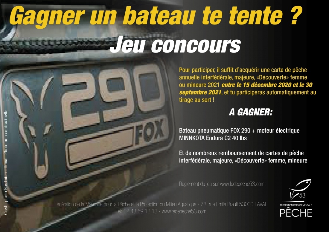 Votre fédération lance un nouveau jeu concours pour vous faire remporter un bateau pneumatique accompagné d'un moteur électrique, et de nombreux remboursements de carte de pêche.