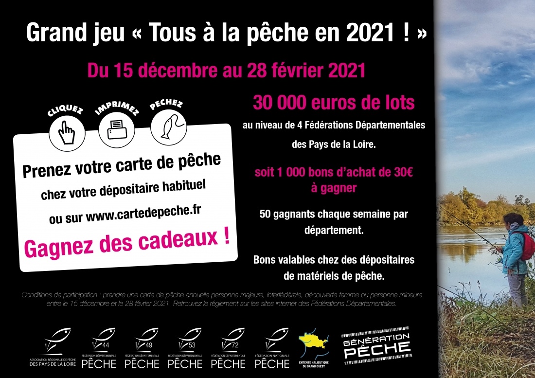 Du 15 décembre 2020 au 28 février 2021 se déroulera un tirage au sort organisé par 4 des 5 fédérations de l’Association Régionale des Fédérations de Pêche des Pays de la Loire (ARFPPL).