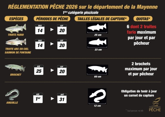 Toutes les infos règlementaires et pratiques sur www.fedepeche53.com/peche-mayenne_reglementation_la-reglementation-departementale.phtml