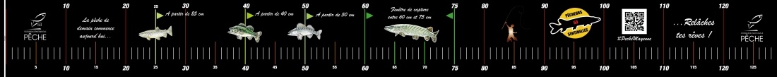En effet, sur celle-ci figurent les tailles légales de capture des espèces emblématiques du département. Vous retrouverez, entre autre, le dessin de la truite fario au niveau de la mesure à 25 cm, du sandre à 50 cm et bien sûr, la double maille 60 cm et 75 cm pour la fenêtre de capture du brochet.