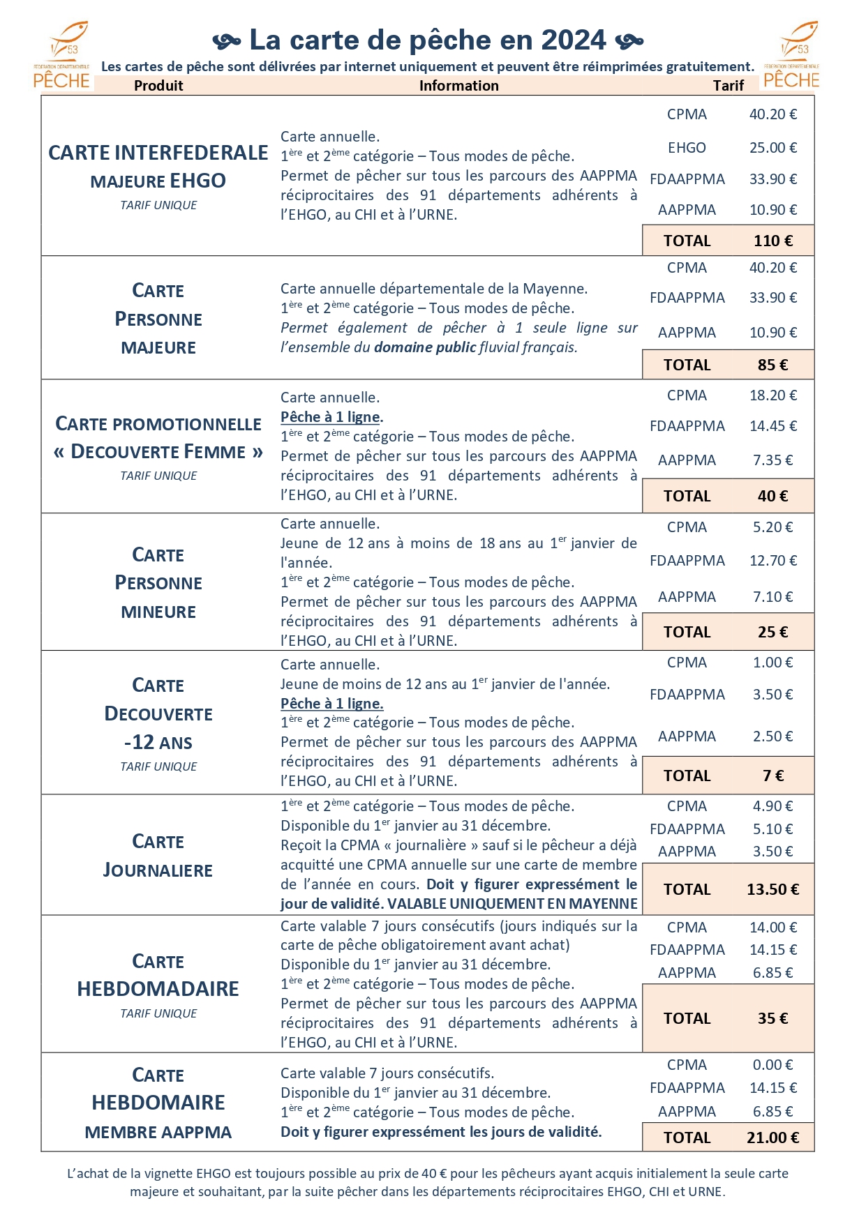 Carte annuelle. PECHE A 1 SEULE LIGNE. 1ère et 2ème catégorie _ tous modes de pêche. Permet de pêcher sur tous les parcours des AAPPMA réciprocitaires des 91 départements adhérents à l'EHGO, au CHI et à l'URNE. (Prix unique). |